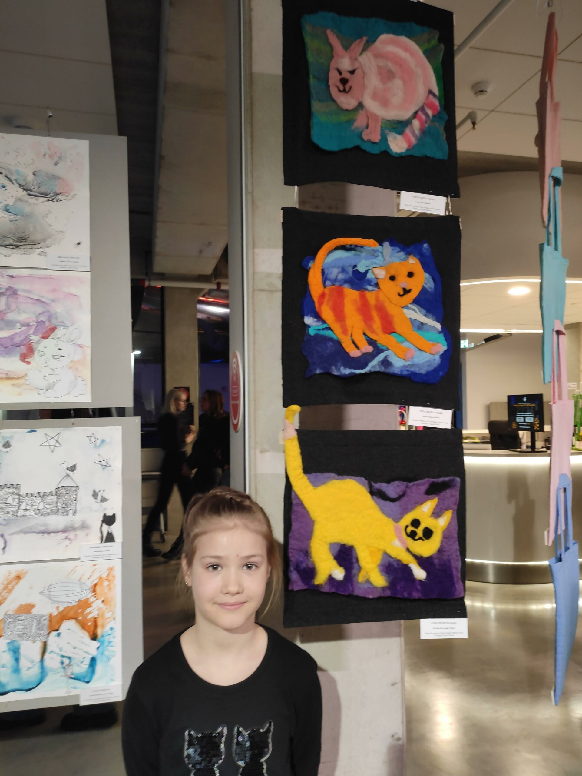 Mūsu skolu pārstāvēja interešu izglītības programmas sagatavošanas grupas audzēknes Kate Tūce, Karlīna Ezermale un Agate Kupča ar tekstila darbu sēriju “Cēsu pilsētas kaķi” – sirsnīgu un radošu skatījumu uz pilsētas noskaņu un tās iemītniekiem.